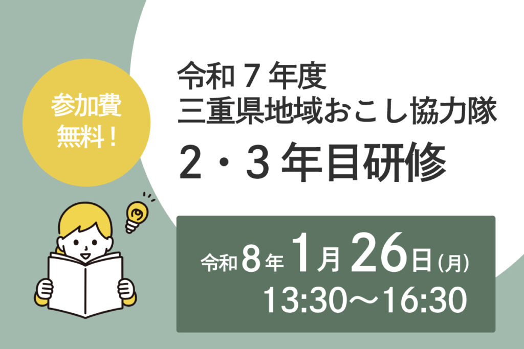 津市で開催する2・3年目研修の申込を受け付けています。 令和7年度2・3年目研修を津市にて開催します。詳細は下記ページをご覧ください。 令和7年度 三重県地域おこし協⼒隊2・3年目研修 【開催日】令和8年1月26日 【応募期限】令和8年1月19日 三重県地域おこし協力隊サポートデスク